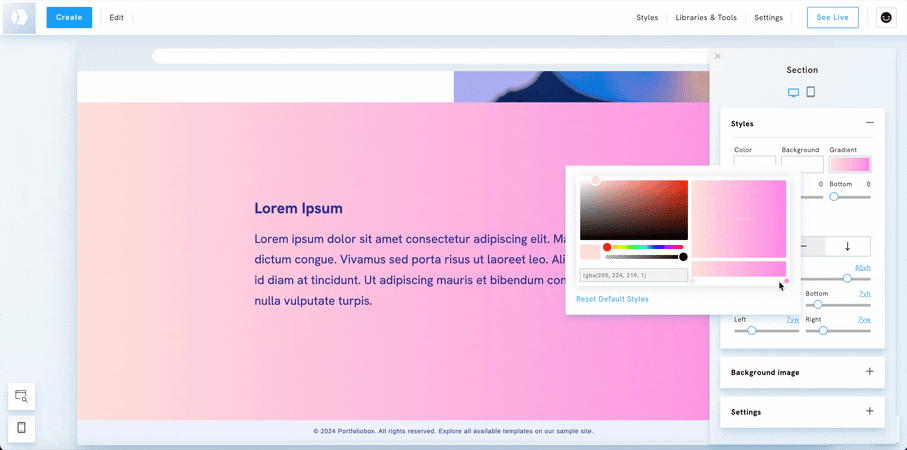 Gradients are a blend of colours that transition smoothly from one to another. They can be linear, radial or conic, creating a dynamic and vibrant effect. By incorporating gradients, you add depth, dimension, and a modern flair to your site.