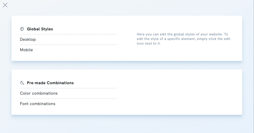 The Styles section offers various options for global and ready-made styles, allowing you to customise your site’s appearance for desktop or mobile viewers.