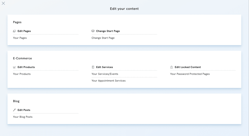 The Create section makes it easy to create new pages, products, blog posts, or bookable appointments or events. You can even create a blank page to start fresh or use an existing page as a template.