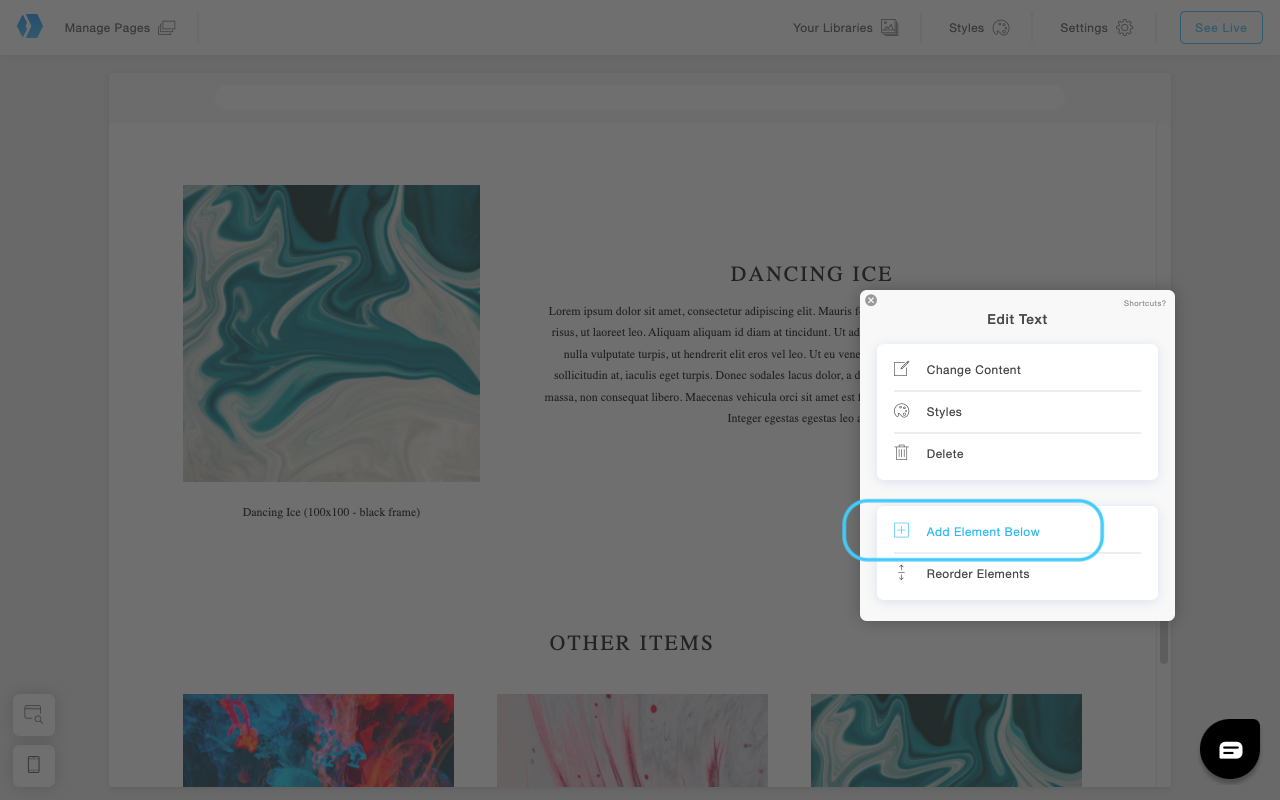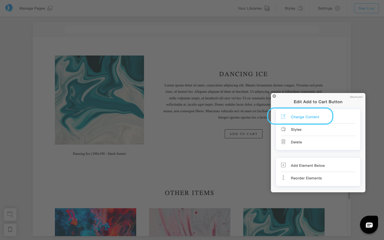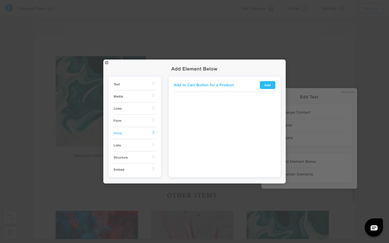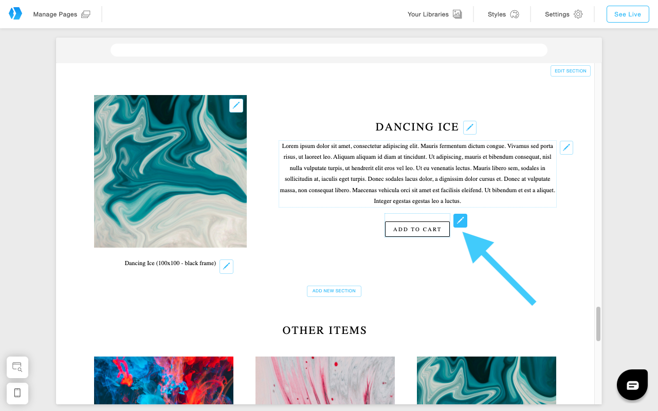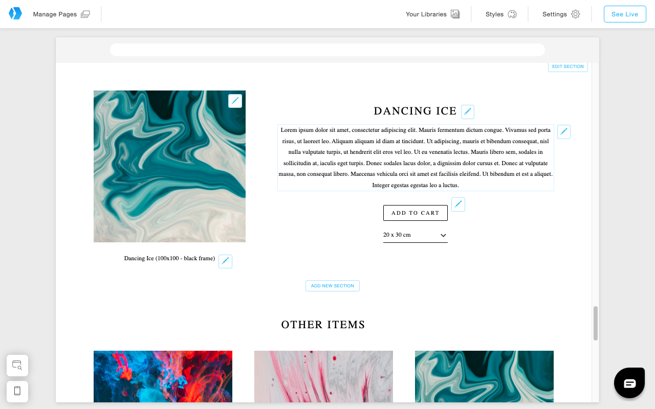 You are not limited to use the product page to sell your items online, as any section can contain an "Add to cart" button. This gives you an option to create a fully customized section or give your product some special attention. The "Add to cart" button can be added by using the Add Element Below option, and selecting type Add to Cart Button for a Product (under Store).