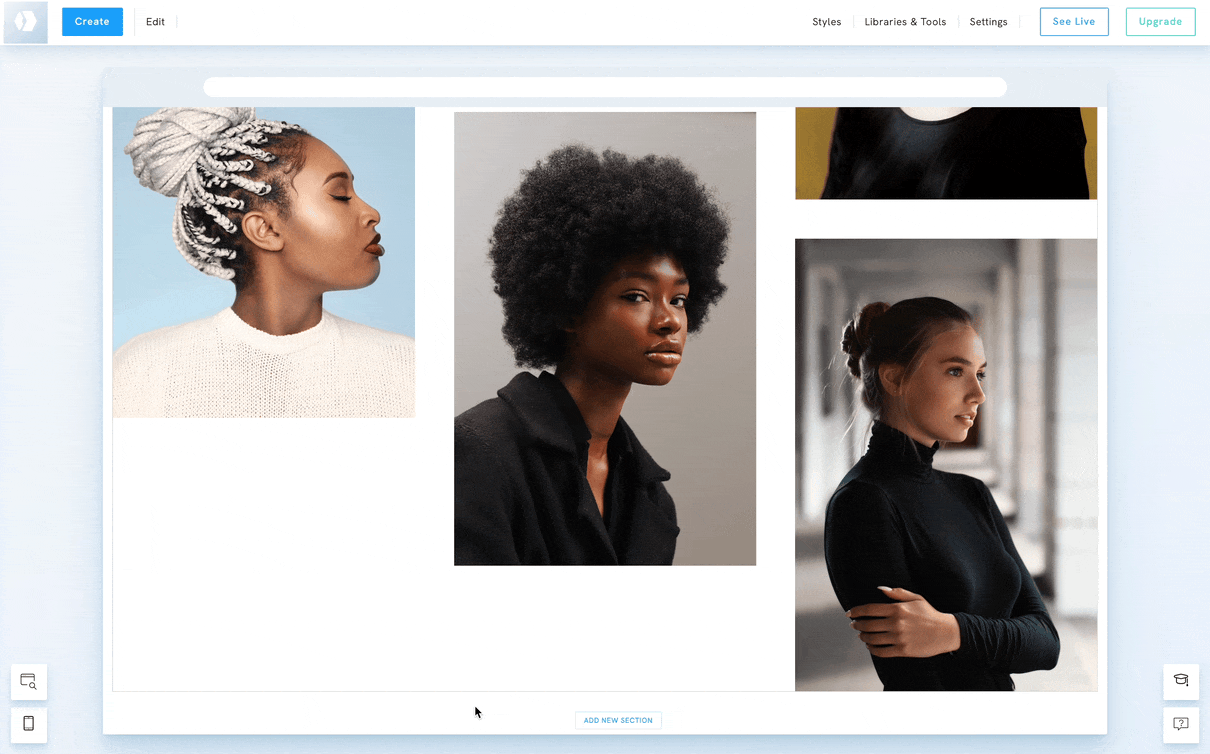 Every page you create on your portfolio is called a section page, meaning you can easily add multiple sections beneath or above your initial content. Sections help you build and organise your portfolio website by mixing different types of content, from galleries and text blocks to contact forms and e-commerce features.
