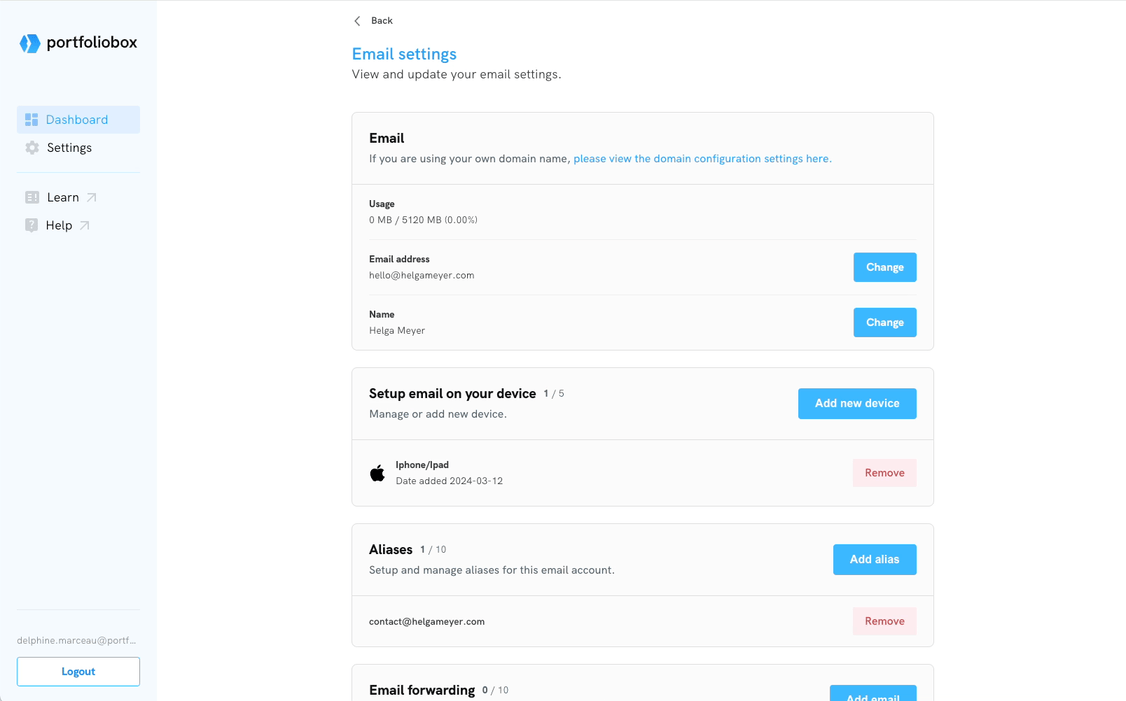 You need to add devices into your Email Settings to integrate your Portfoliobox email with external email clients.